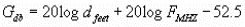 حيث G كسب الهوائي بالديسبل، F التردد بالميجاهرتز.