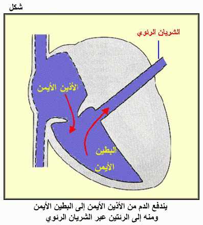 يندفع الدم من الأذين الأيمن إلى البطين الأيمن ومنه إلى الرئتين عبر الشريان الرئوي