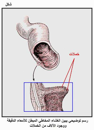 رسم توضيحي يبين الغشاء المخاطي المبطن للأمعاء الدقيقة ووجود الآلاف من الخملات