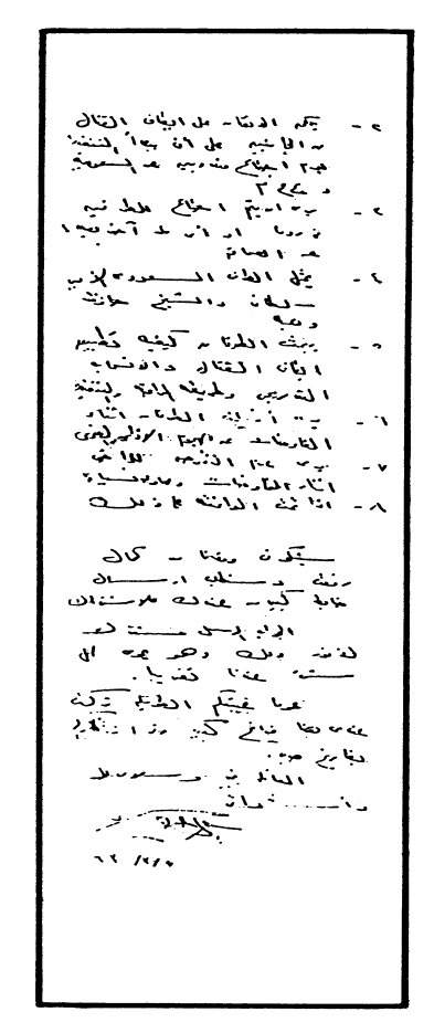 1.        يجب تجاهل سعود وموقفه تجاهلاً تاماً وأن فيصل قد أفاق لنفسه بعد ما أدرك أنه مخلب قط في يد الإنجليز.
