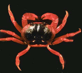 السرطان الشائع واسمه العلمي جيكارسينس لاترالس Gecarcinus lateralis يكثر حيث الغطاء النباتي الوافر وفوق الصخور وليلي النشاط