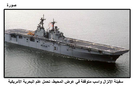 سفينة الإنزال واسب متوقفة في عرض المحيط، تحمل علم البحرية الأمريكية
