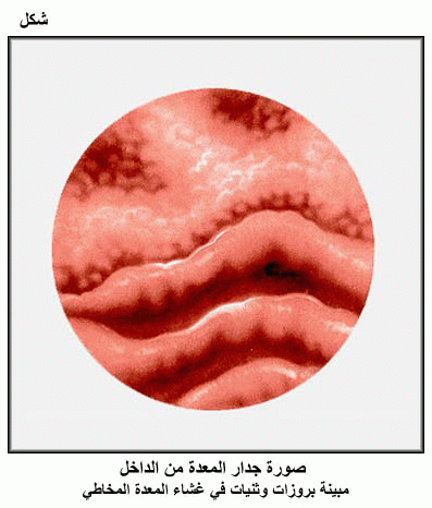 صورة جدار المعدة من الداخل مبينة بروزات وثنيات في غشاء المعدة المخاطي