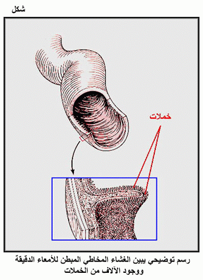 رسم توضيحي يبين الغشاء المخاطي المبطن للأمعاء الدقيقة ووجود الآلاف من الخملات