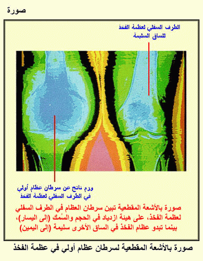 صورة بالأشعة المقطعية لسرطان عظام أولي في عظمة الفخذ