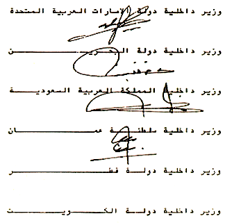 وبناءً على تفويض المجلس الأعلى في دورته الرابعة عشرة المنعقدة بالرياض في شهر رجب 1414هـ الموافق ديسمبر 1993م لوزراء الداخلية بإعادة صياغة الاتفاقية الأمنية والتوقيع عليها، فقد تم التوقيع على هذه الاتفاقية بمدينة الرياض يوم الاثنين 25 جمادي الآخرة 1415هـ الموافق 28 نوفمبر 1994م من كل من:-