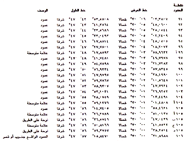 دال -   إحداثيات الحدود على امتداد خط المياه المنخفضة بين أم قصر وملتقى الخورين