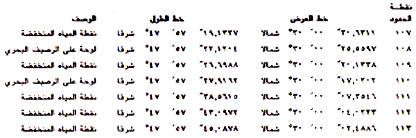 122 -   يقع خط الحدود الواصل من العمود رقم 106 على امتداد الخط الجيوديسي الباديء من العمود رقم 90 إلى العمود رقم 106. وتقع نقطة الحدود رقم 107 على تقاطع هذا الخط الجيوديسي مع خط تحديد المياه المنخفضة بالتصوير الفوتوغرافي. ونقطة الحدود رقم 134 تقع عند النقطة الواقعة على خط المياه المنخفضة، وهي الأقرب إلى ملتقى الخورين (نقطة الحدود رقم 135).