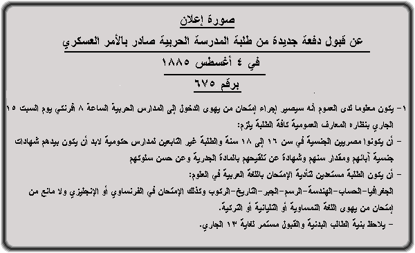 إعلان عن قبول دفعة جديدة من طلبة المدرية الحربية صادر بالأمر العسكري في 4 أغسطس 1885