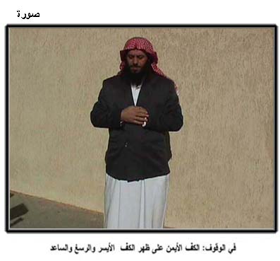 في الوقوف: الكف الأيمن على ظهر الكف الأيسر والرسغ والساعد