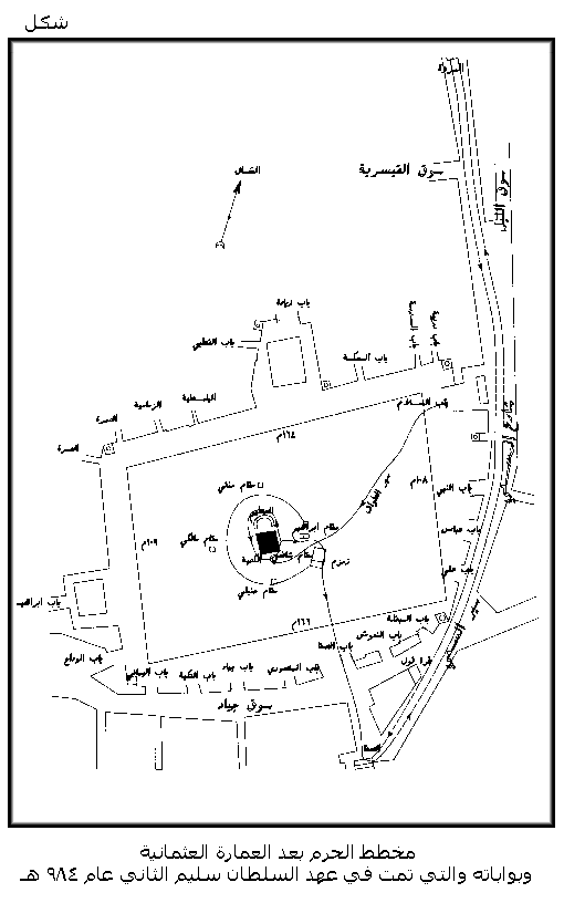 مخطط الحرم بعد العمارة العثمانية وبواباته والتي تمت في عهد السلطان سليم الثاني عام 984هـ